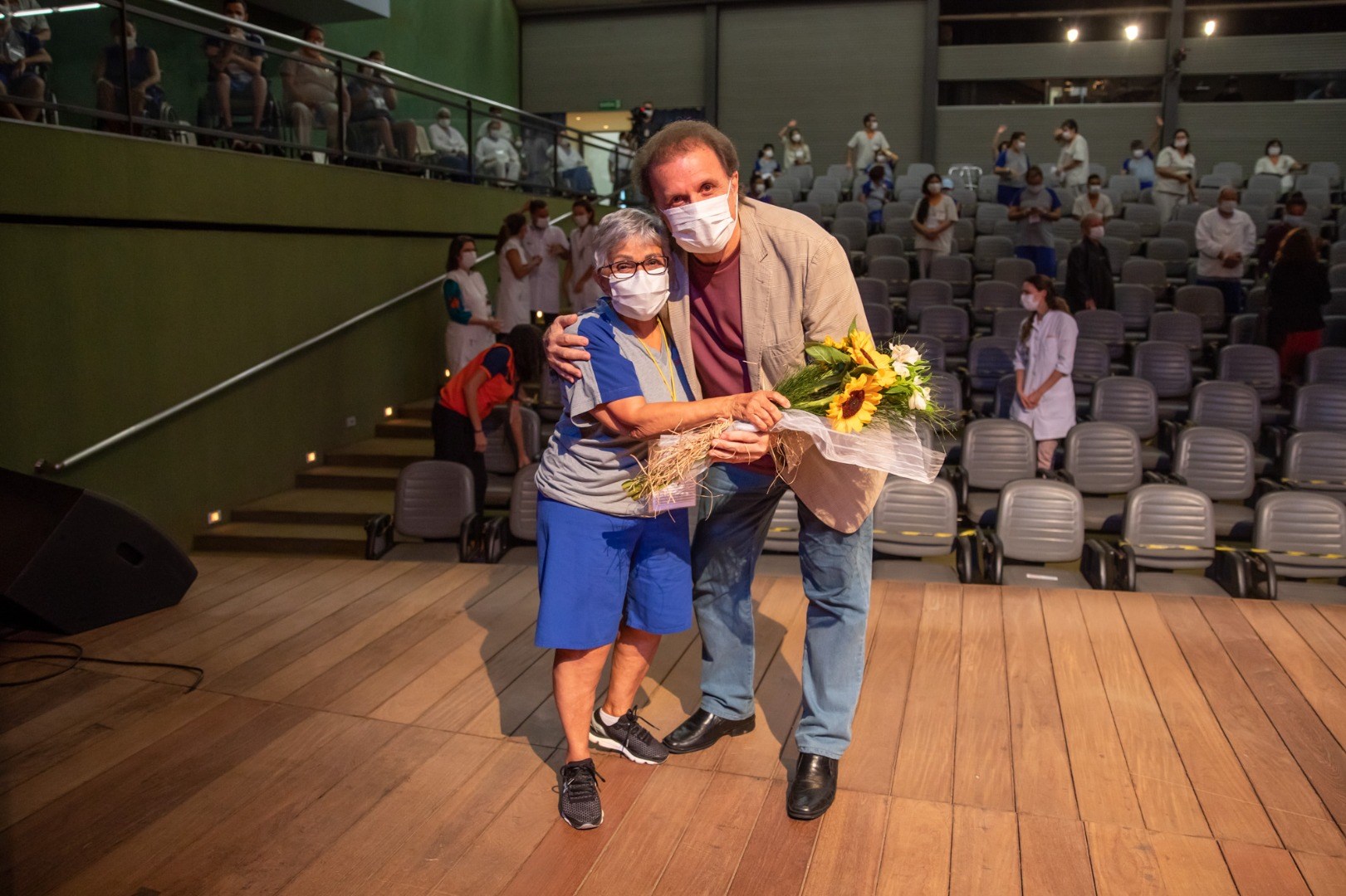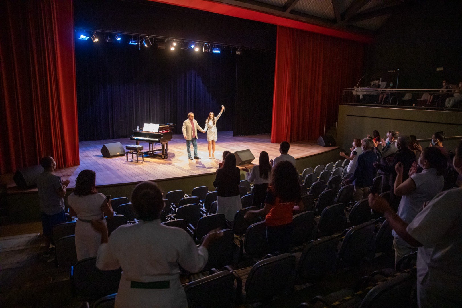 Marina Elali e Eduardo Lages envolveram e animaram a tarde dos pacientes, familiares e colaboradores do hospital que acompanharam cantando com entusiasmo e emoção.
