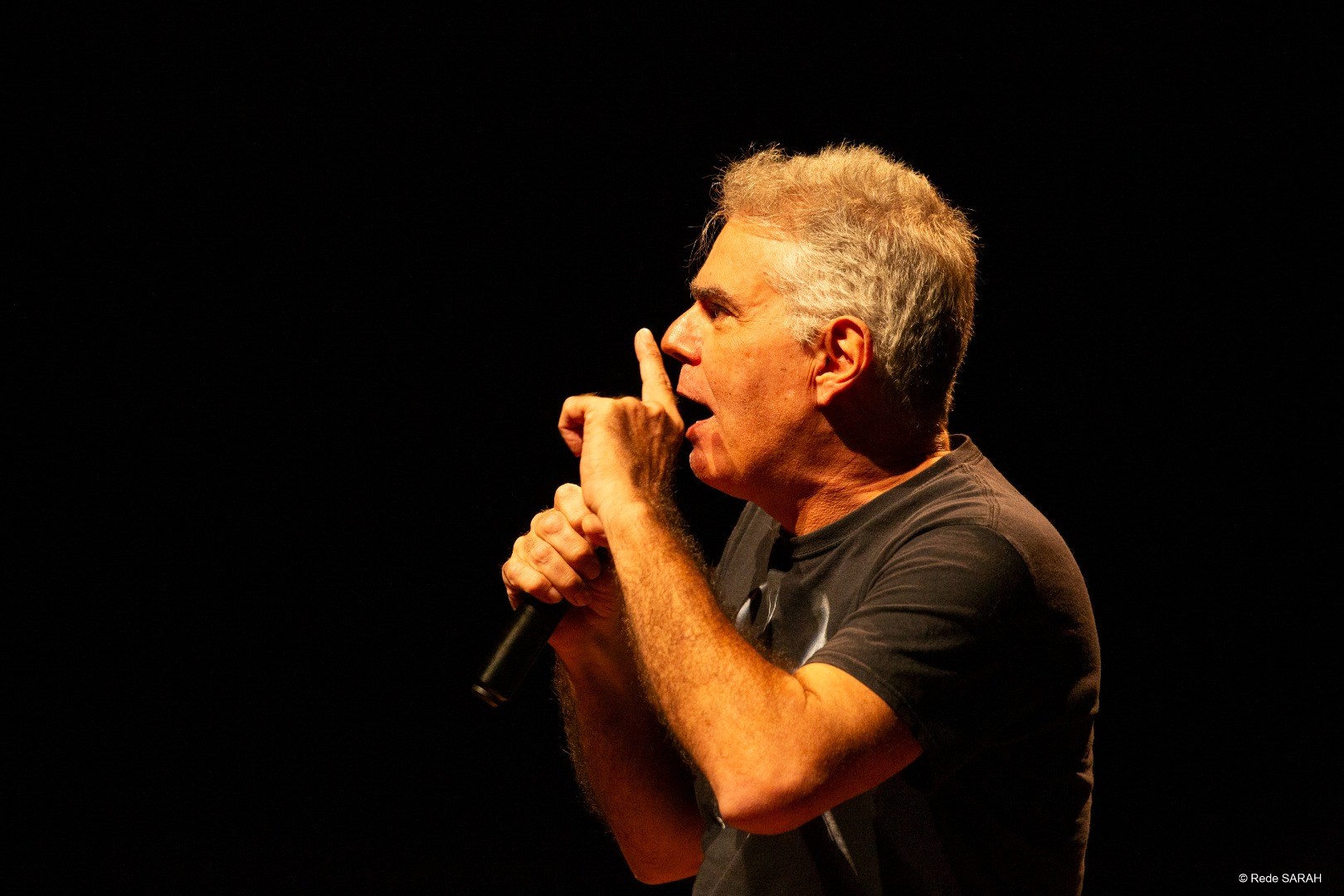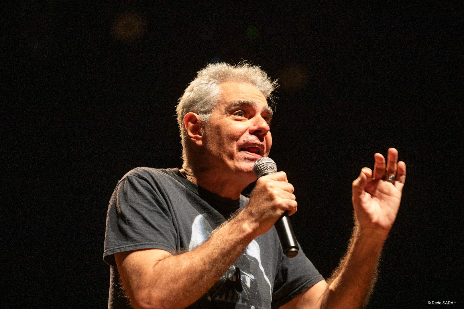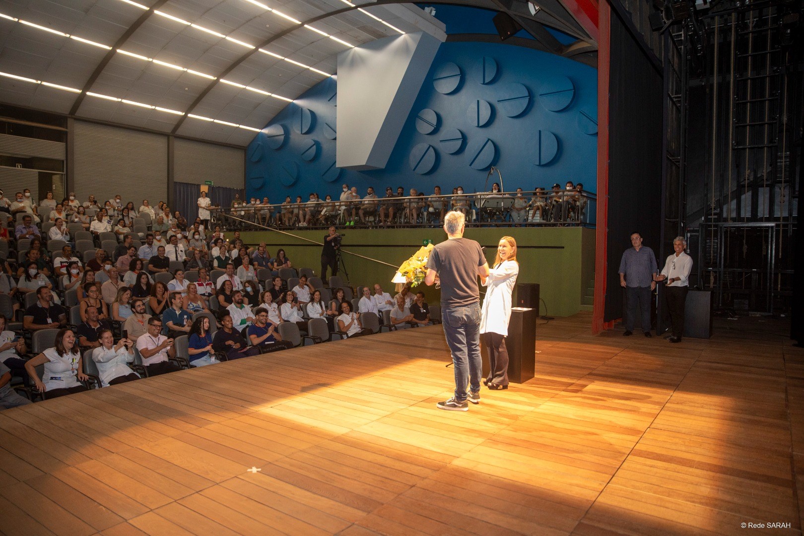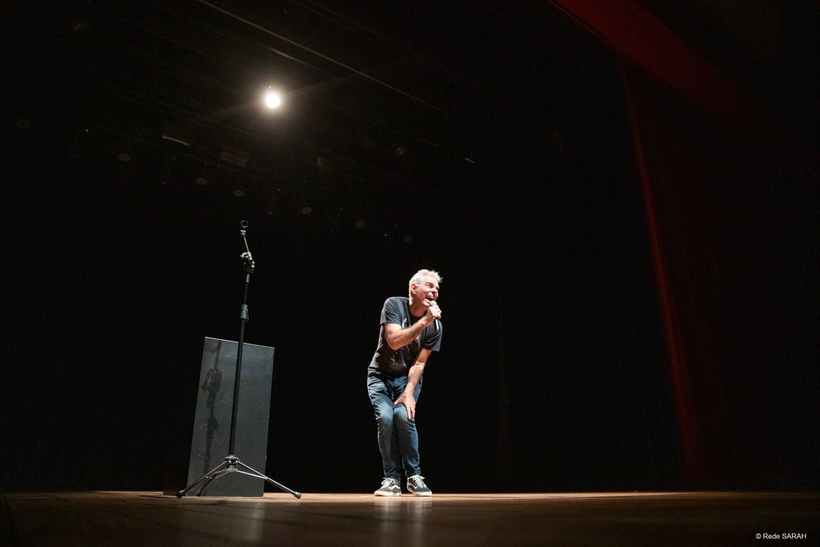 O comediante Nizo Neto apresentou o espetáculo humorístico “Aqui Tem Arte” na tarde do dia 21 de novembro de 2023, no Teatro SARAH. Seguindo o formato stand-up, em que o cômico – sozinho e de pé – interage com a plateia com improvisos e passagens ensaiadas, Nizo trouxe à comunidade SARAH um humor entre desinibido e escrachado.