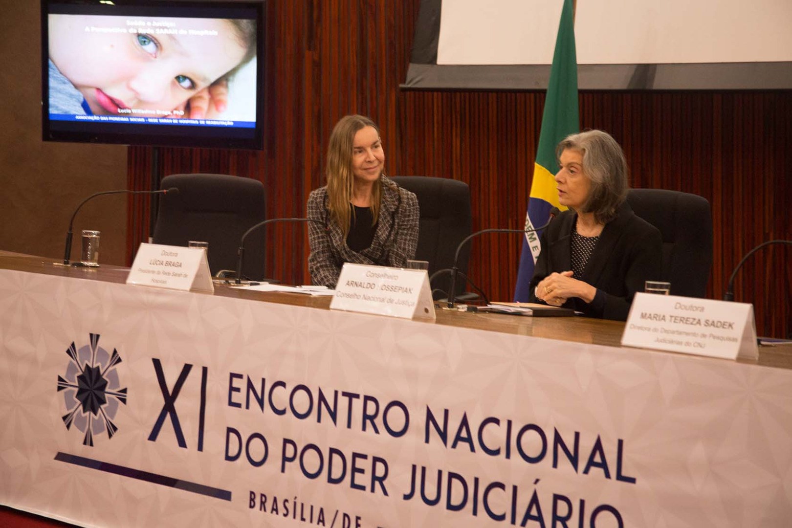 No dia 21 de novembro, no “XI Encontro Nacional do Poder Judiciário”, a Dra. Lúcia Willadino Braga, Presidente da Rede Sarah, proferiu a palestra “Saúde e Justiça: A Perspectiva da Rede SARAH”. O convite foi feito pela Ministra Carmem Lúcia, Presidente do Supremo Tribunal Federal e do Conselho Nacional de Justiça (C.N.J). O Conselho está lançando uma plataforma com base em evidências científicas para promover subsídios técnicos aos Tribunais para auxiliar na tomada de decisões relacionadas à saúde. A Dra. Lucia apresentou princípios filosóficos e resultados da Rede Sarah e expôs como são geradas e utilizadas as bases de evidências científicas na área da saúde.