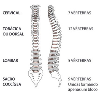 Para compreender as possíveis causas de dores na coluna cervical ou lombar (“dor na nuca” ou “dor nas costas”), é importante conhecer um pouco sobre a anatomia da coluna vertebral. A coluna é formada por 33 ossos chamados vértebras, que se localizam umas sobre as outras. As vértebras apresentam diferenças entre elas: as mais resistentes (lombares e sacrais) estão localizadas na base da coluna, as menos resistentes, mas que permitem maior movimentação, estão localizadas no ápice. Devido às diferenças entre as vértebras, a coluna é dividida em quatro regiões: